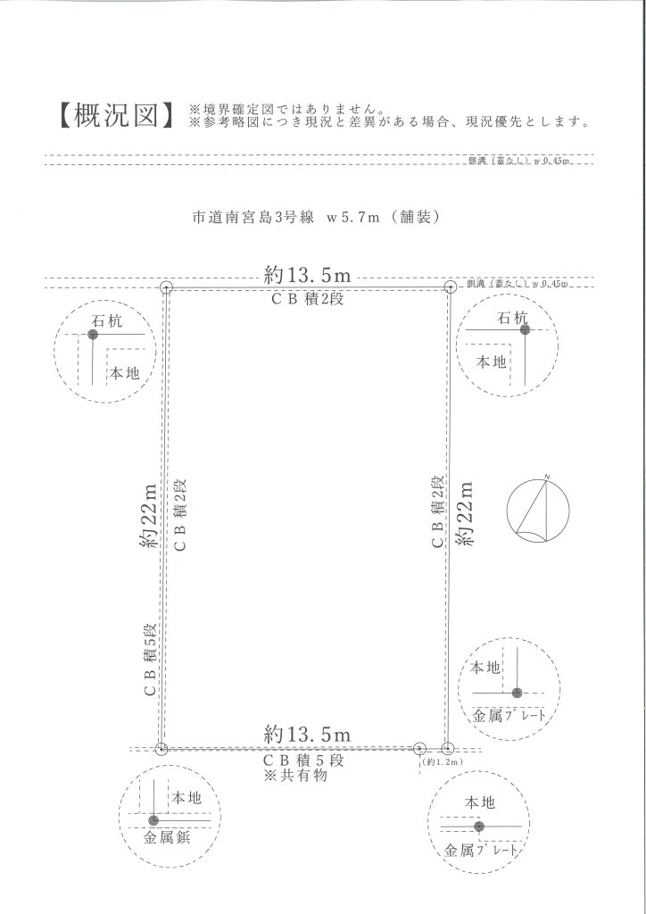 ※現地に境界明示(石杭、金属鋲、金属プレート)があり現況引渡しとなります。
